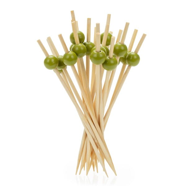 Stylowe patyczki z drewna bambusowego zakończone dekoracyjną, drewnianą oliwkową kulką. Idealne do serwowania przystawek, finger foodów i koreczków na eventach, bankietach i imprezach firmowych. Wykonane z naturalnego, biodegradowalnego materiału – ekologiczna alternatywa dla plastiku.