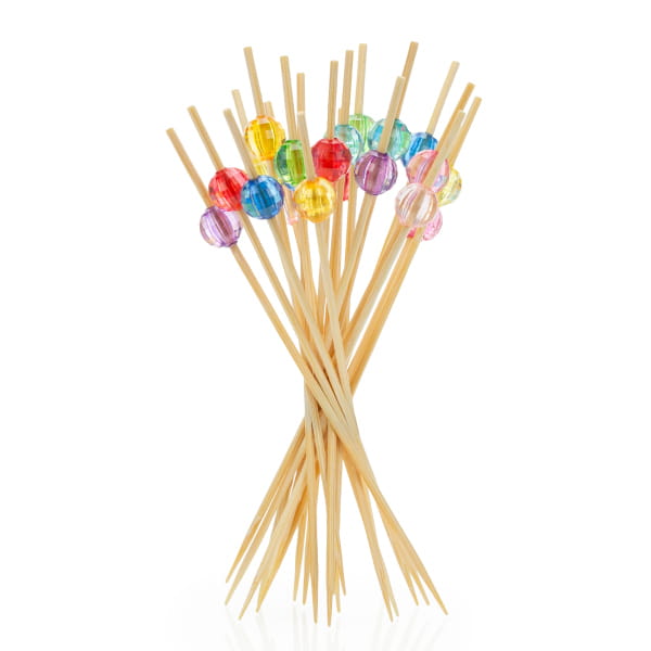 Stylowe patyczki z drewna bambusowego zakończone dekoracyjną kulką. Idealne do serwowania przystawek, finger foodów i koreczków na eventach, bankietach i imprezach firmowych. Wykonane z naturalnego, biodegradowalnego materiału – ekologiczna alternatywa dla plastiku.