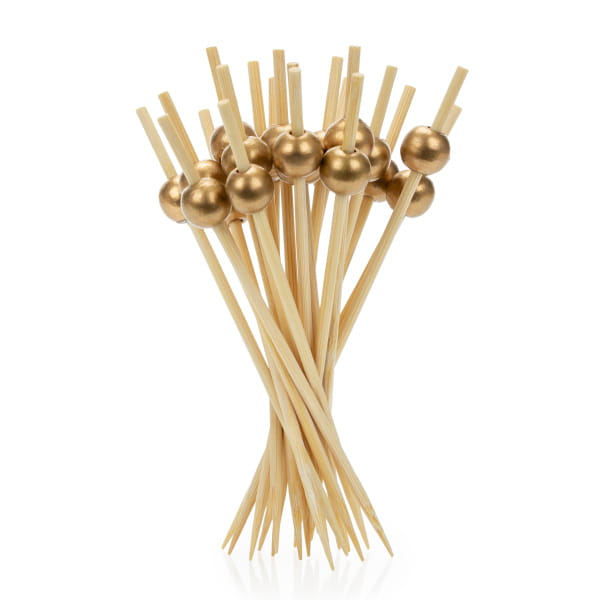 Stylowe patyczki z drewna bambusowego zakończone dekoracyjną, drewnianą złotą kulką. Idealne do serwowania przystawek, finger foodów i koreczków na eventach, bankietach i imprezach firmowych. Wykonane z naturalnego, biodegradowalnego materiału – ekologiczna alternatywa dla plastiku.
