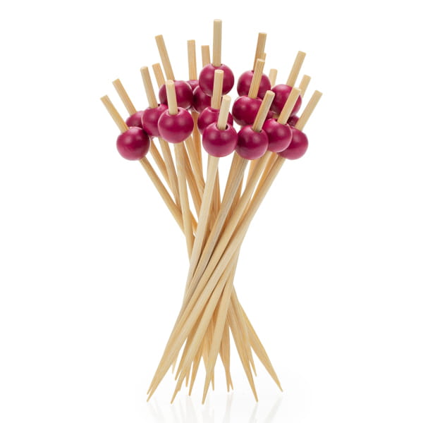 Stylowe patyczki z drewna bambusowego zakończone dekoracyjną, drewnianą bordową kulką. Idealne do serwowania przystawek, finger foodów i koreczków na eventach, bankietach i imprezach firmowych. Wykonane z naturalnego, biodegradowalnego materiału – ekologiczna alternatywa dla plastiku.