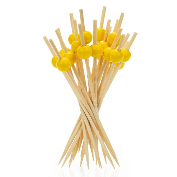 Stylowe patyczki z drewna bambusowego zakończone dekoracyjną, drewnianą żółtą kulką. Idealne do serwowania przystawek, finger foodów i koreczków na eventach, bankietach i imprezach firmowych. Wykonane z naturalnego, biodegradowalnego materiału – ekologiczna alternatywa dla plastiku.
